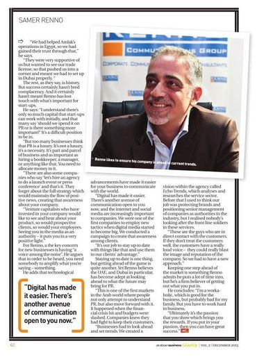 “I’m rarely one to facilitate introductions or offer recommendations. However I consistently make an exception when it comes to Samer. Samer is a seasoned PR specialist with an established network of personal contacts across the Middle East. His experience is incredibly diverse, having worked with many of the world’s largest brands in a market that's often a mystery to Western companies. I love the way he thinks and operates. In my experience he has a rare ability to truly bridge two cultures; Arab and Western. He's also a genuinely likeable guy. I trust him and happily recommend Renno Communications Group to anyone that asks for a Middle East contact.”
